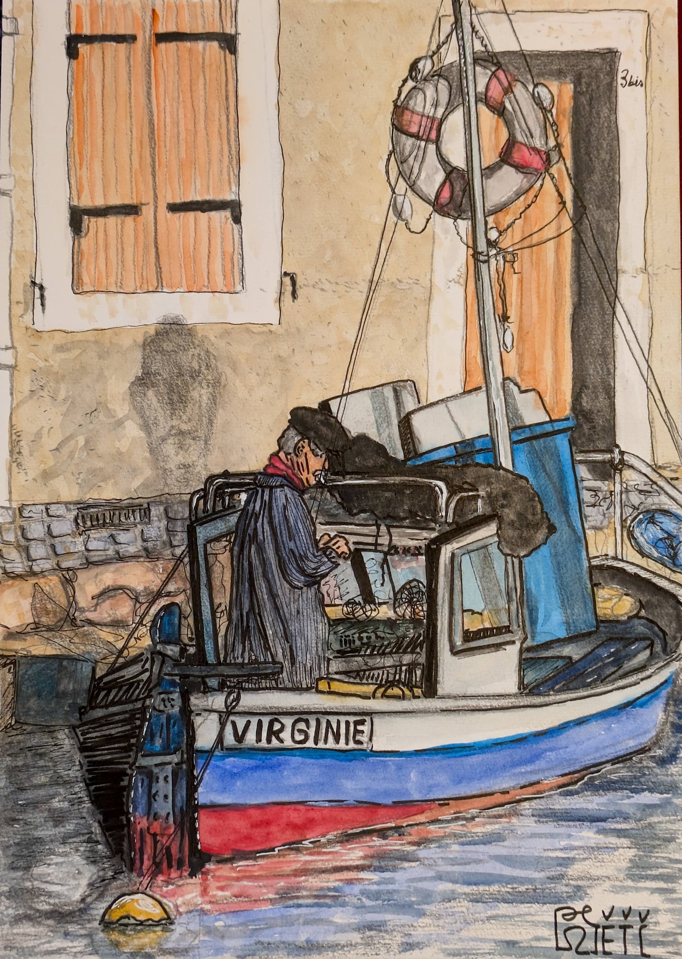 Pescador en el Puerto de Colliure, Francia. Acuarela sobre papel.