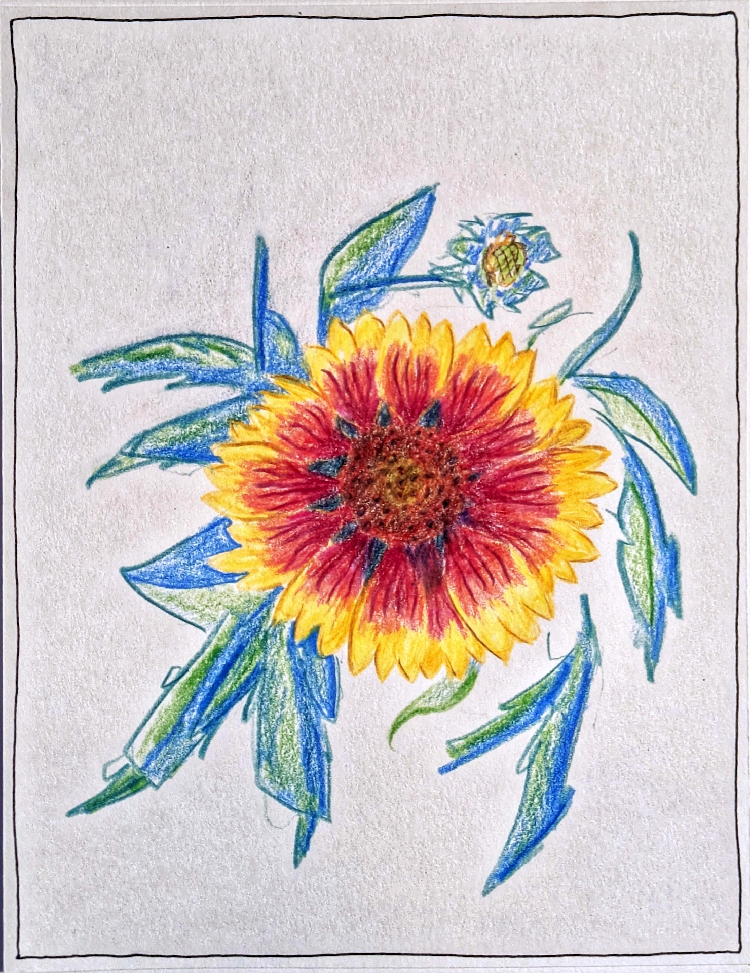 Dibujo en lapices de color de una flor de manta (Gaillardia).