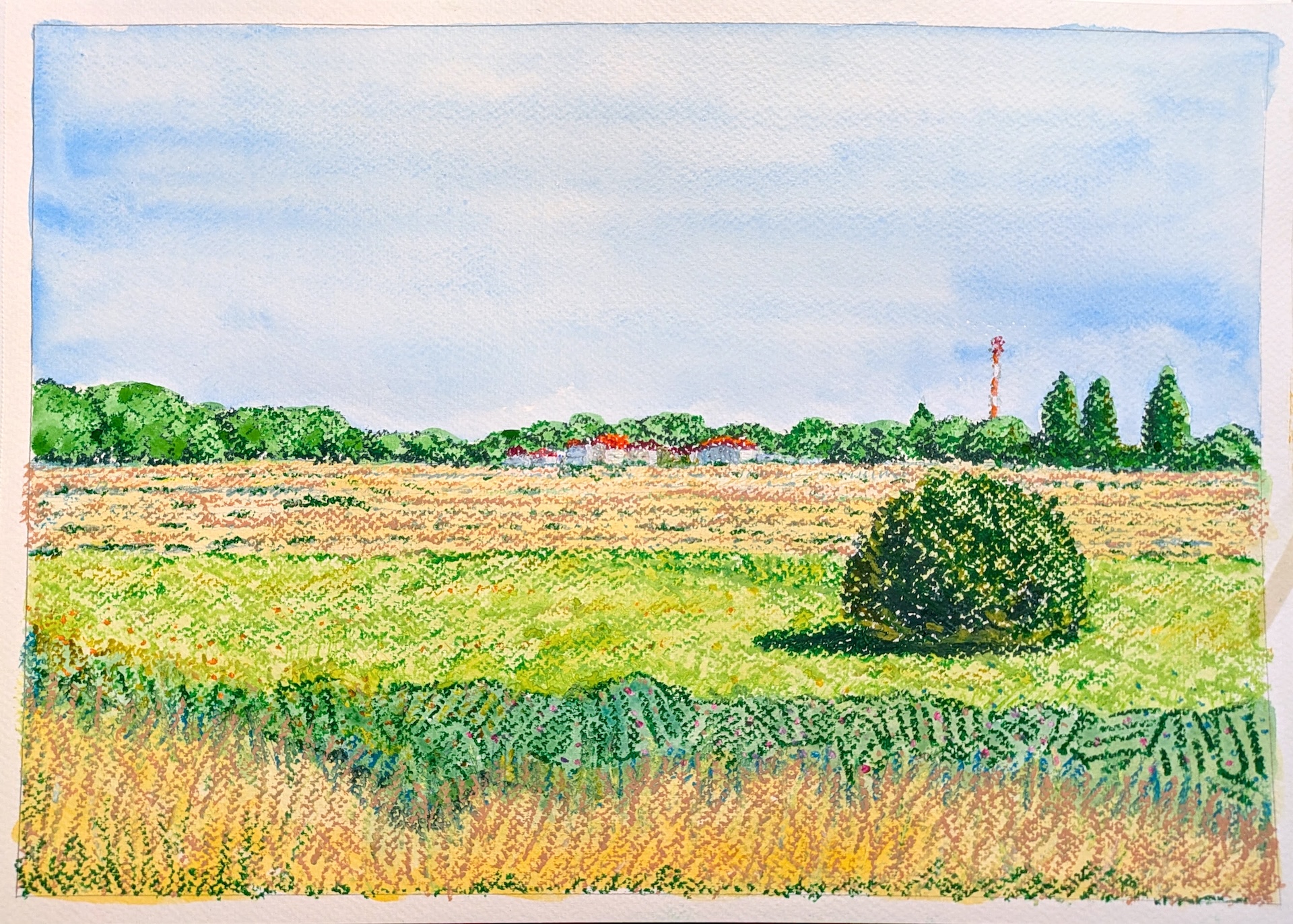 Paisaje de campo en Villebon, Francia. Oleo pastel y acuarela sobre papel.