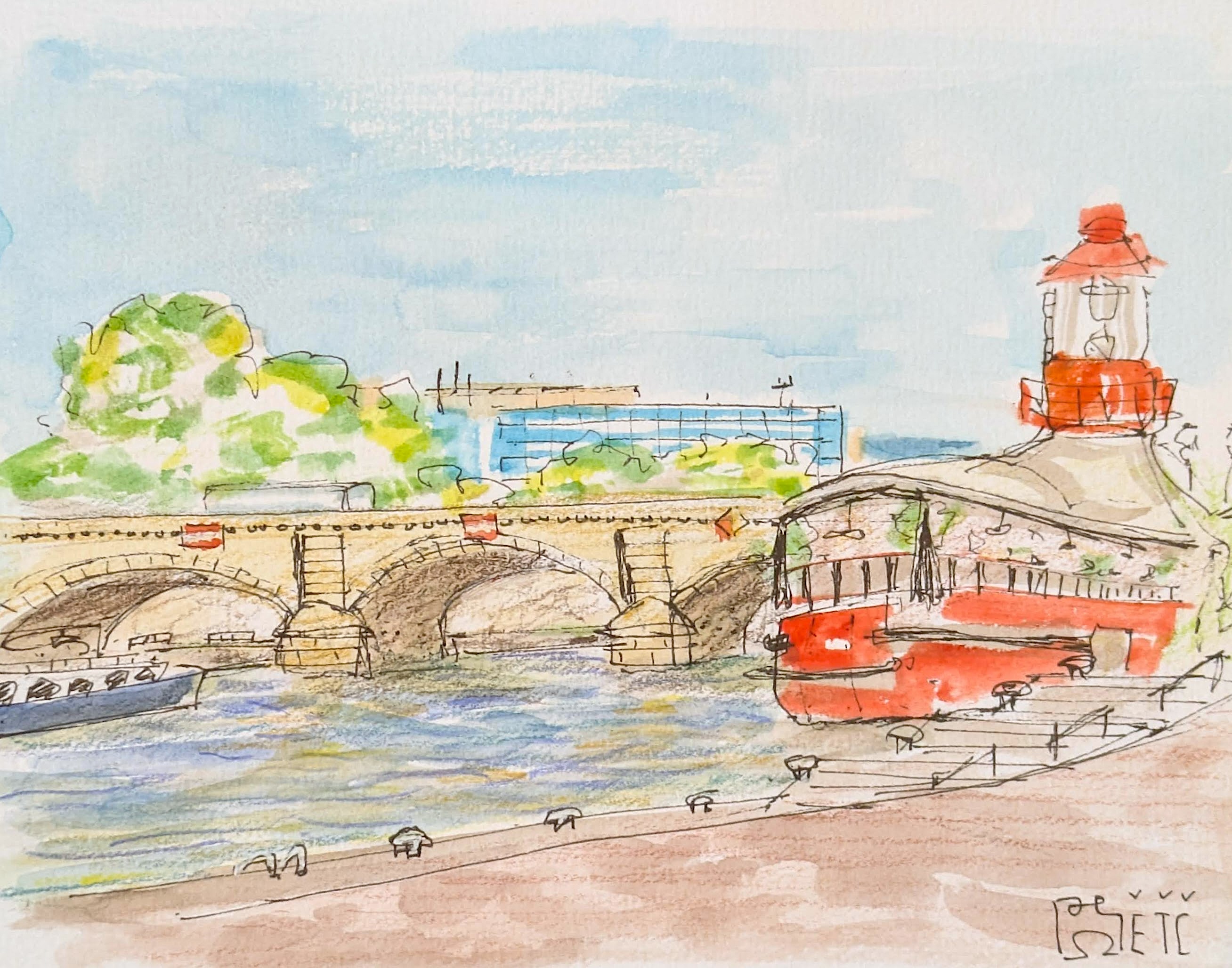 Postale du bateau phare en face de la bibliothèque François Mitterrand, 14e arrondissement, Paris. Aquarelle et crayons de couleur sur papier.