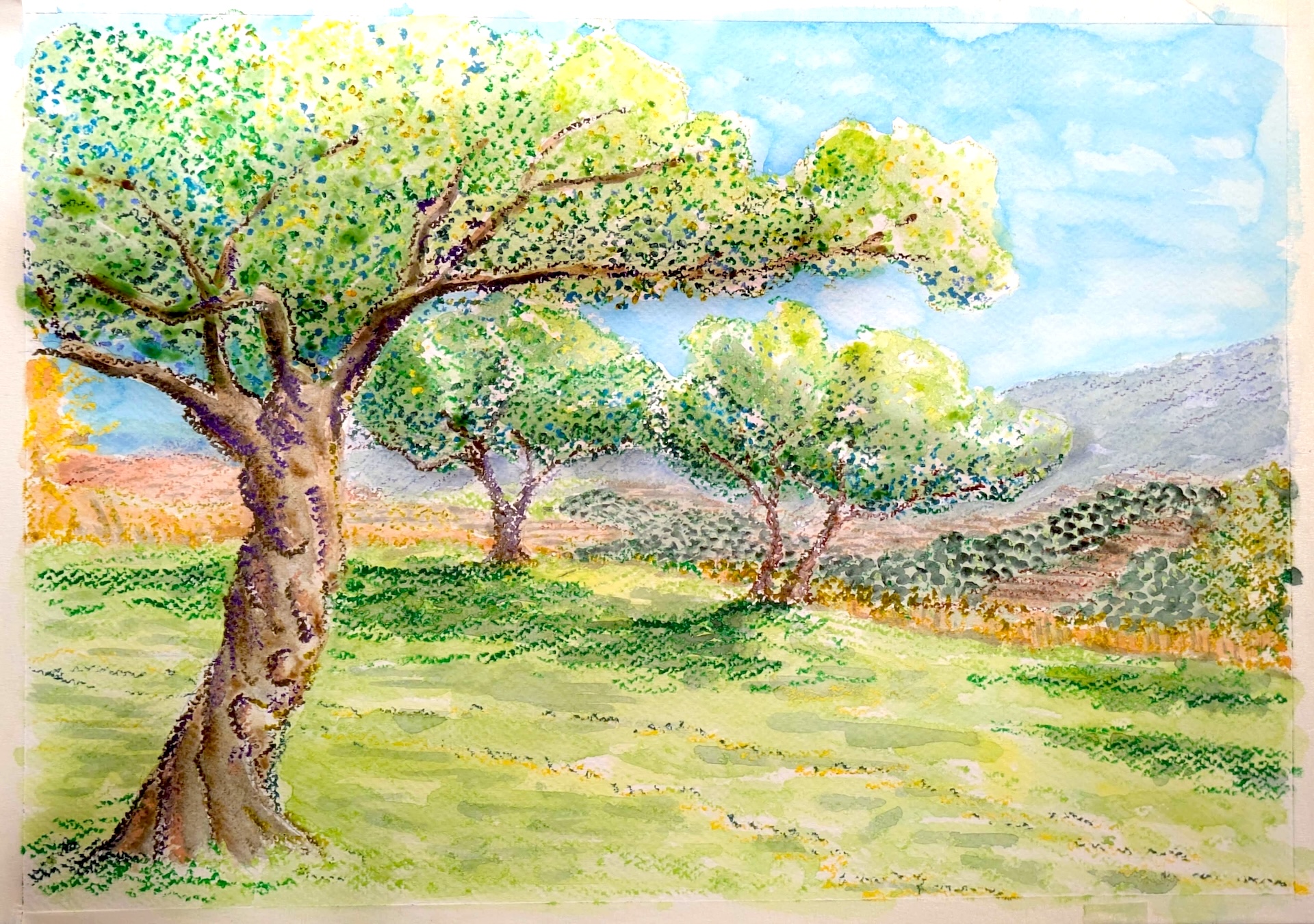 Olivar en las afueras de Heraklion, Creta, Grecia. Pastel al óleo y acuarela sobre papel.