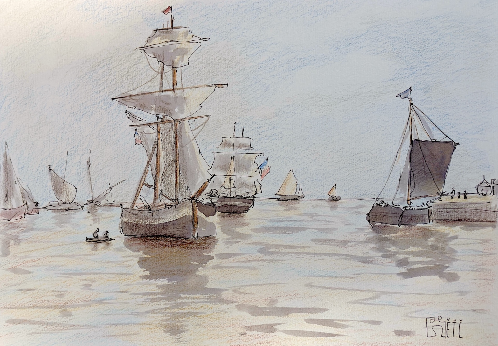 Paisaje naval. Tinta negra y lápices de colores sobre papel.