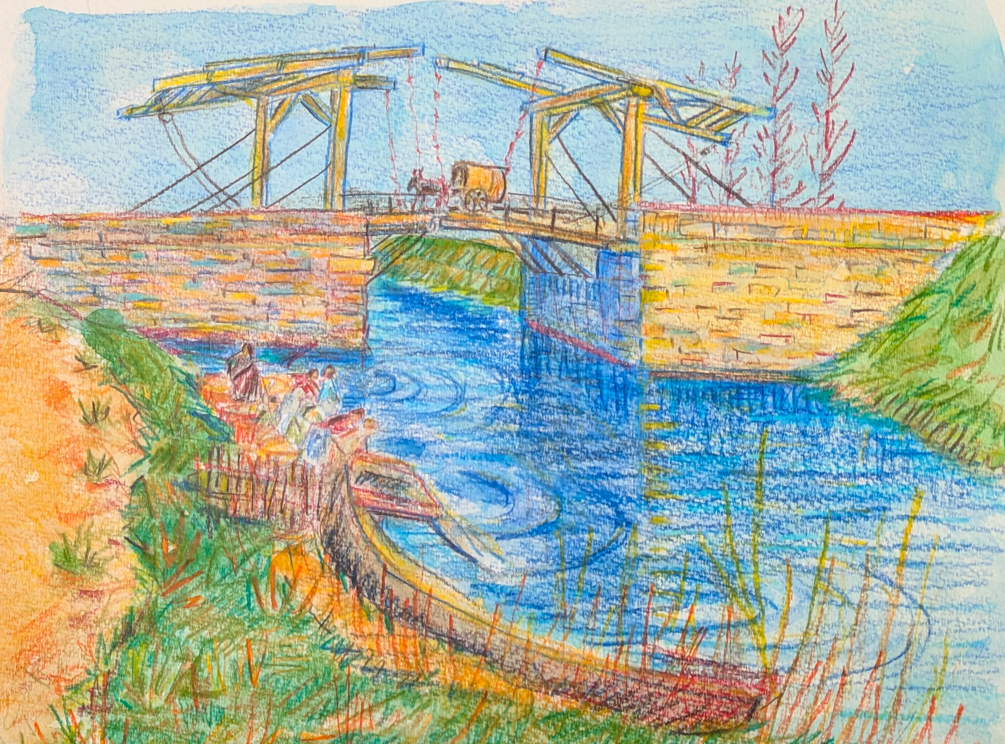 Copia de "Pont de Langlois", de Vincent van Gogh. Lapices de colores sobre papel.
