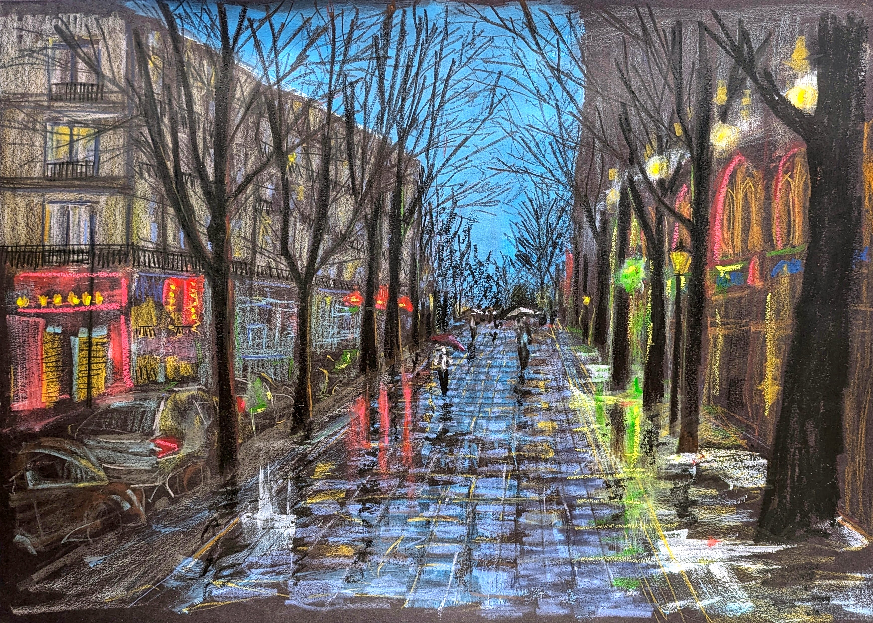 Pluie dans le quartier chinois de Paris. Pastel huile et crayon de couleur sur papier.
